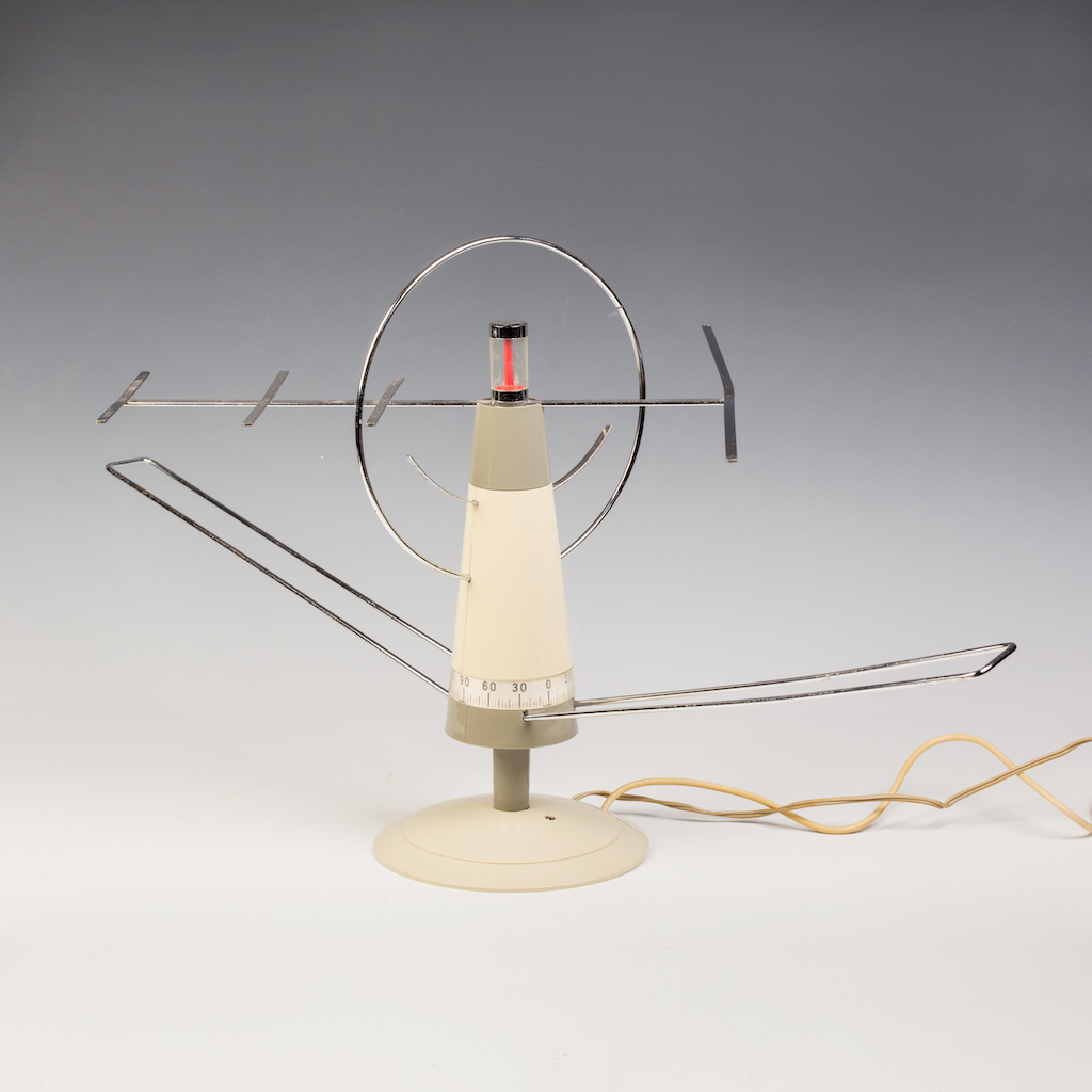 Kovové chromované díly anténního přijímače. Hlavní tělo vyrobeno z šedého plastu. Dnes již spíše úsměv na rtech vyvolávající objekt natáčecí dipólové antény. Přesto potěší jak svou estetikou, tak i případnou funností.