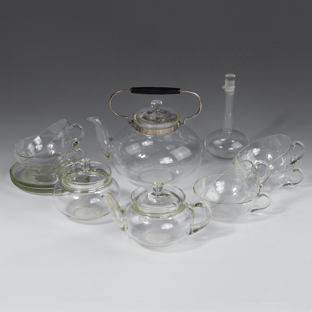Foukané křemičito-borité sklo ( Palex) do formy. Na Konvici použita kovová montura. Servis se skládá z konvice, cukřenky, mléčenky, rumovky a šest šálků s podšálky. Ikona Československého funkcionalismu. Perfektní stav. Vše značeno leptem.