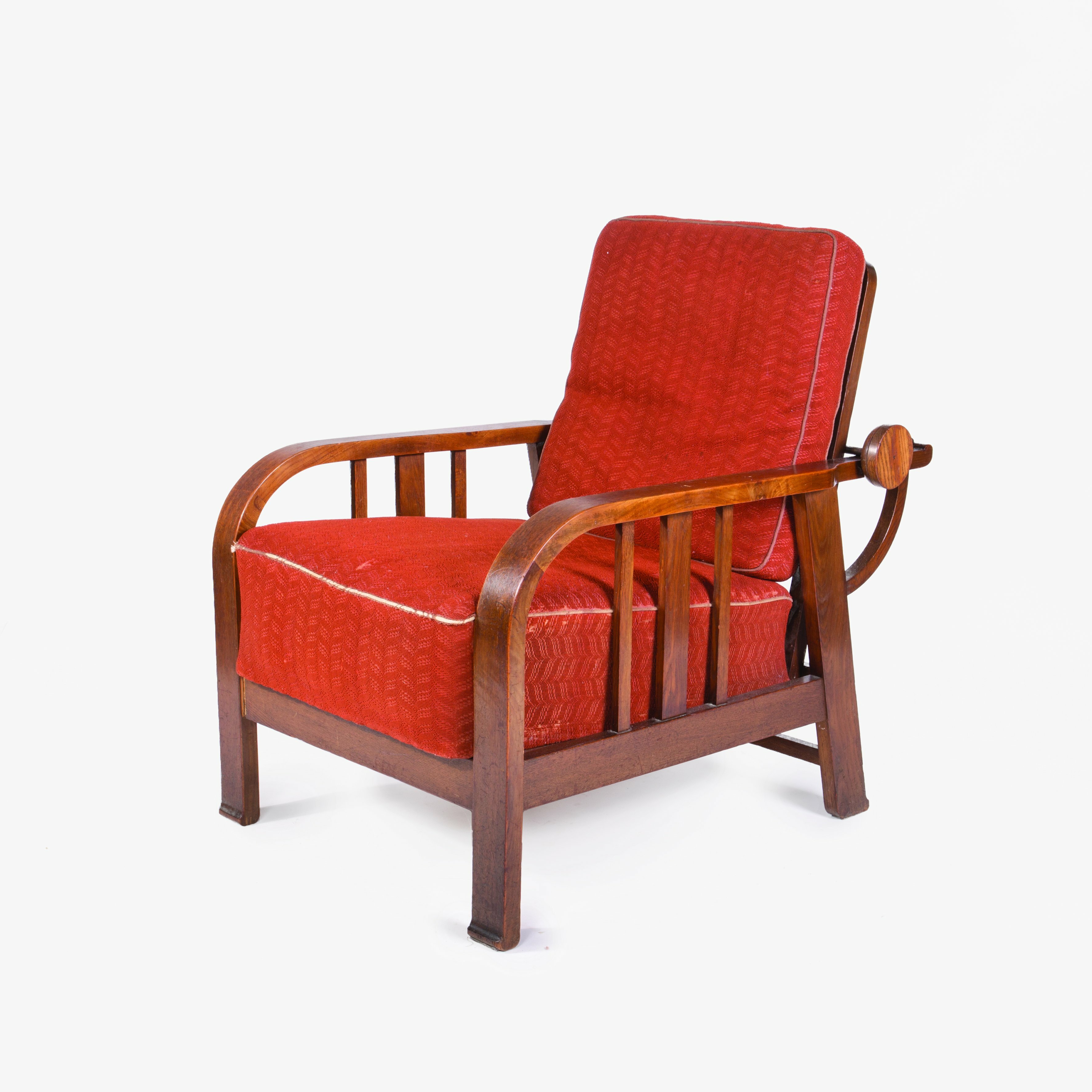 Celodřevěná konstrukce vyrobena z lakovaného dubového masivu. Opěradlo nastavitelné do několika poloh. Sedadlo i opěrák s původním červeným čalounem. Opěrák odnímatelný. Charakteristickým prvkem tohoto kusu nábytku jsou netypické patky na koncích nohou.