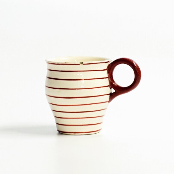Bělnina glazovaná čirou glazurou s horizontálně malovanými hnědými proužky. Drobné oťuky na horní hraně. Hrneček s ouškem patří do jednoho z prvních souborů - baňatého tvaru, navržených tímto významným představitelem kubismu pro družstvo Artěl. Unikátnost tohoto kusu je o to zajímavější, že byl doposud znám pouze z dobové fotografie. Jedinečný muzeální kus.