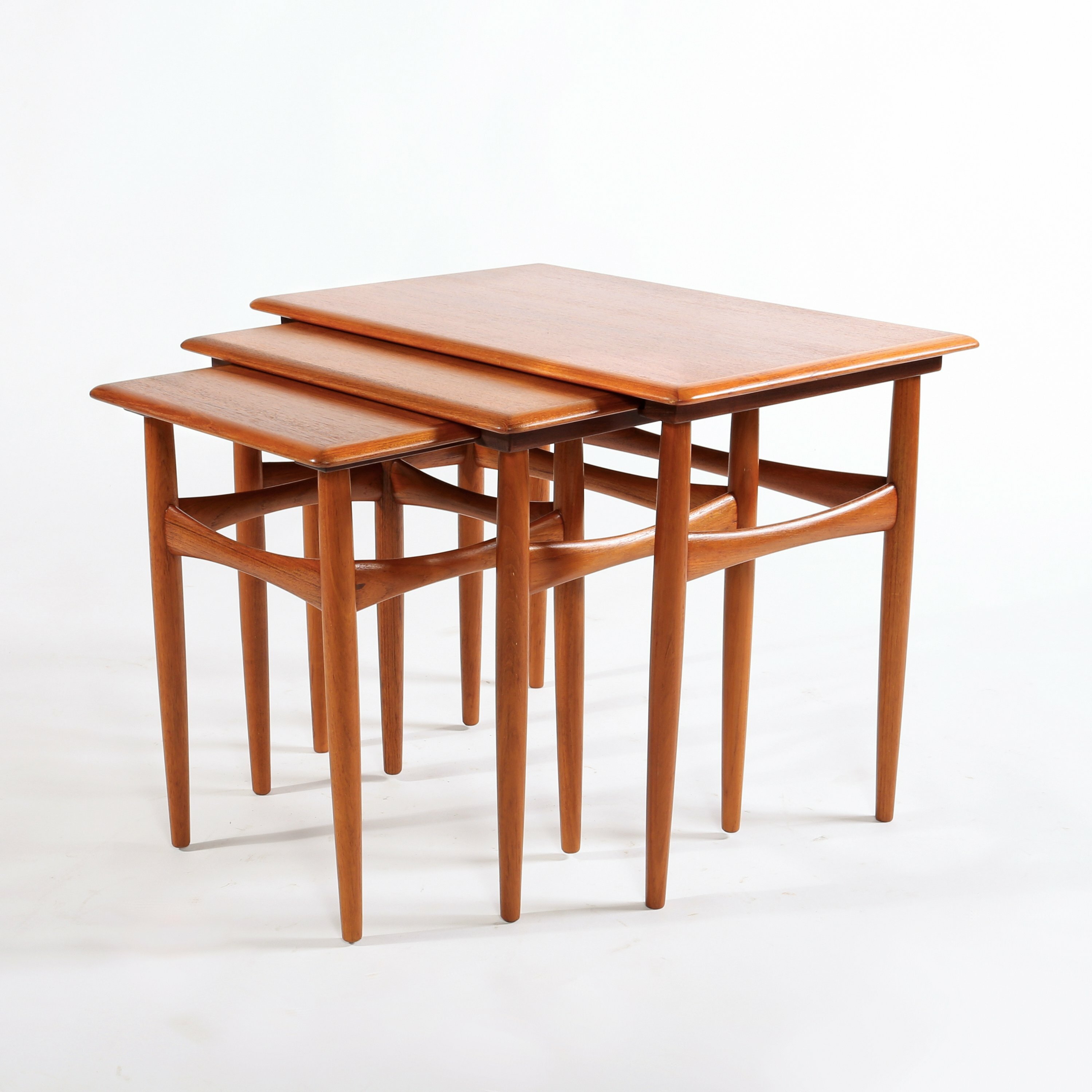 Sada čtyř hnízdových stolků z teakového dřeva. Konstrukce z masivu, deska dýhovaná. Okraje stolu zbroušeny pod úkosem. Typický produkt skandinávského designu, jak si jej všichni představujeme. Elegance, funkčnost a perfektně zpracovaný materiál. Špičkový stav.