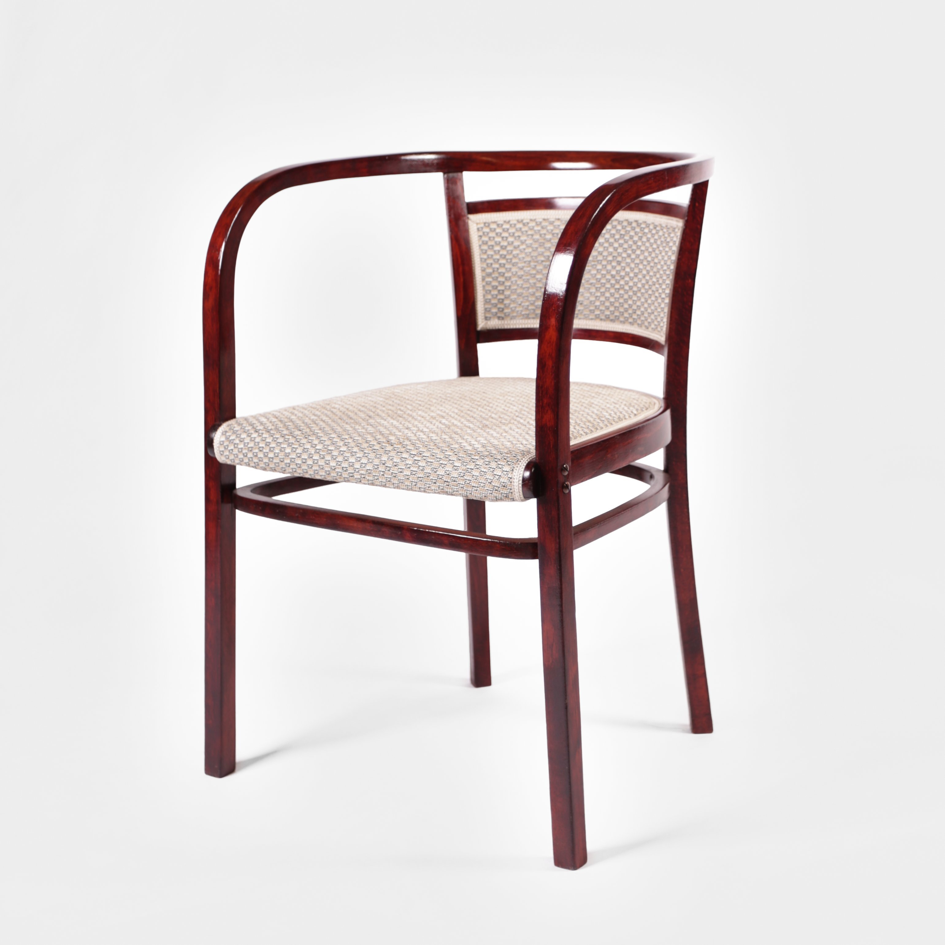 Křeslo zhotoveno z červeně mořeného bukového hranolu s šelakovou politurou. Sedák a opěrák nově čalouněn. Celkově křeslo prošlo renovací. Křeslo bylo původně navrženo pro Postsparkasse ve Vídni.